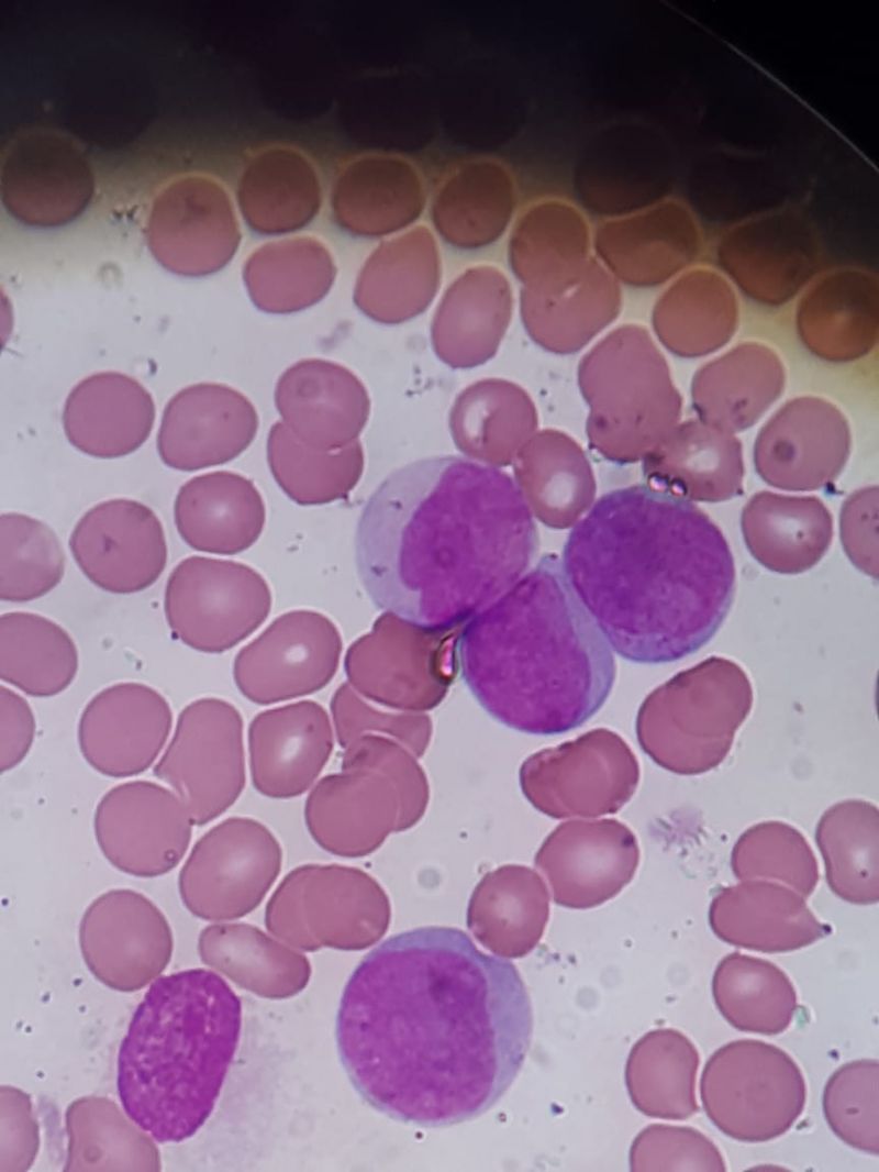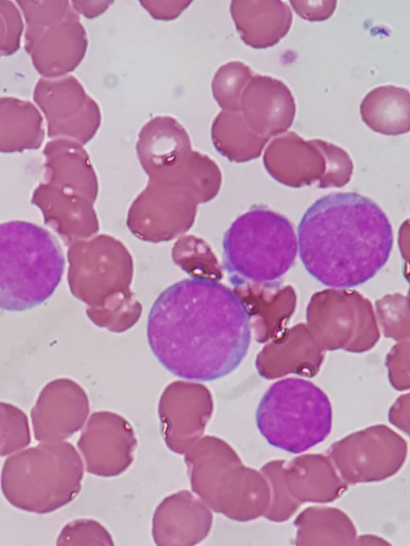 Percebe-se claramente a tríade leucêmica ao analisar o hemograma. Os blastos não apresentam bastonetes de auer, entretanto mostram inclusões que lembram os corpos de PHI.
