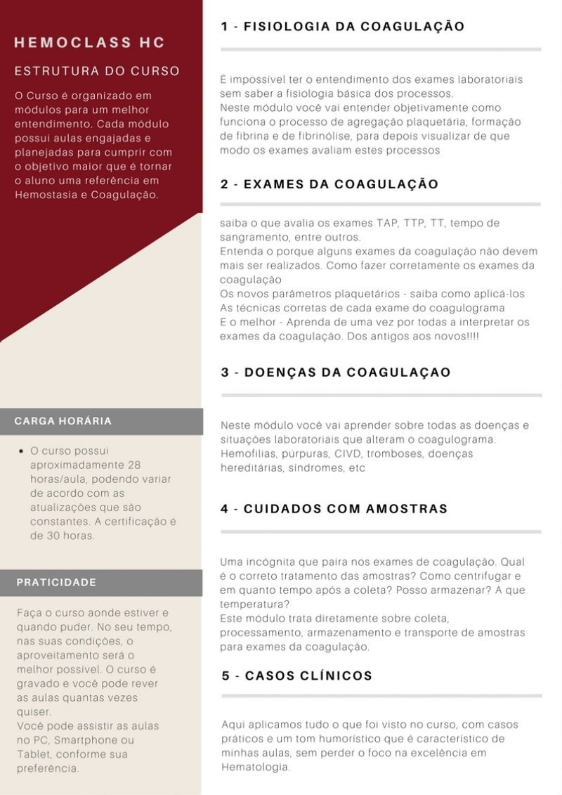 Eu ja adquiri o curso e já estou fazendo. Pra mim está sendo de grande valia pois eu tinha esta parte muito confusa, e o curso apresenta de uma maneira simples, objetiva e nos faz entender corretamente cada fase da coagulação e para que cada exame deve ser realizado. Estou achando fantástico, pois apesar da correria do dia a dia podemos escolher o melhor momento para assistir as aulas. Parabéns ao Prof. Merisio e a Hemoclass. Estou aguardando os próximos -